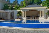 - 7 x 4,5 méteres feszített víztükrű kültéri úszómedence, szélén vízeséssel,