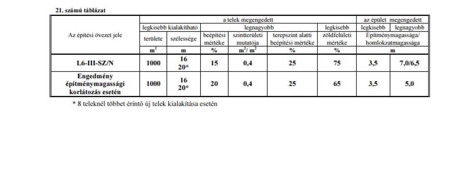 15%-os beépíthetőség, 7 méteres építménymagasság, szintterületi mutató: 0,4 nm/nm