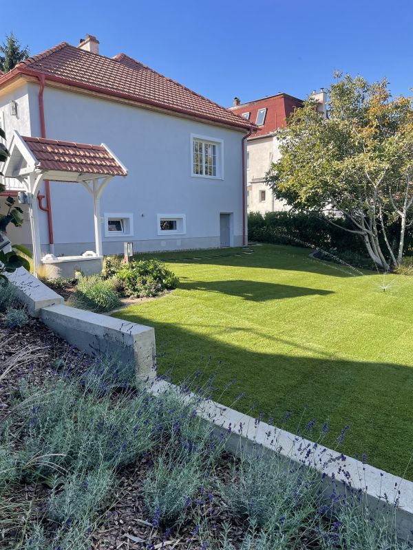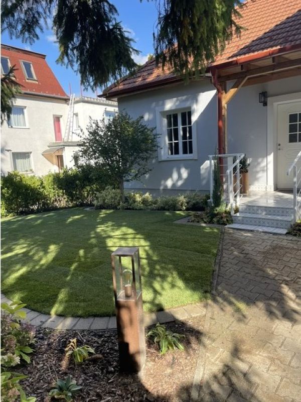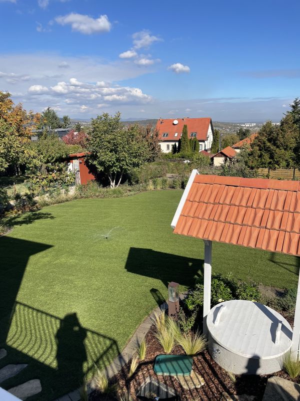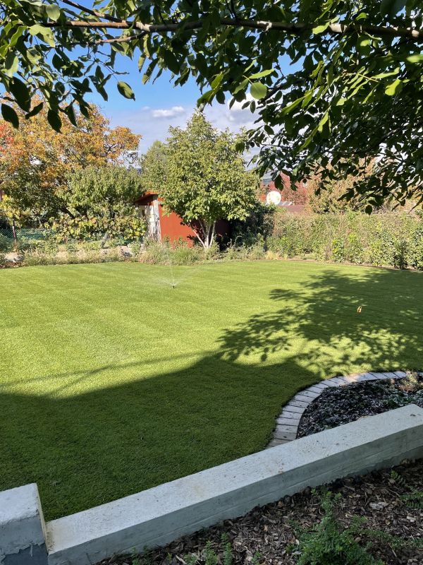 A kert rendezése befejeződött, a locsolórendszer telepítése megtörtént. Saját kút adja a locsolórendszernek a vizet. A kertépítési módja lehetővé teszi majd robot alkalmazását.
